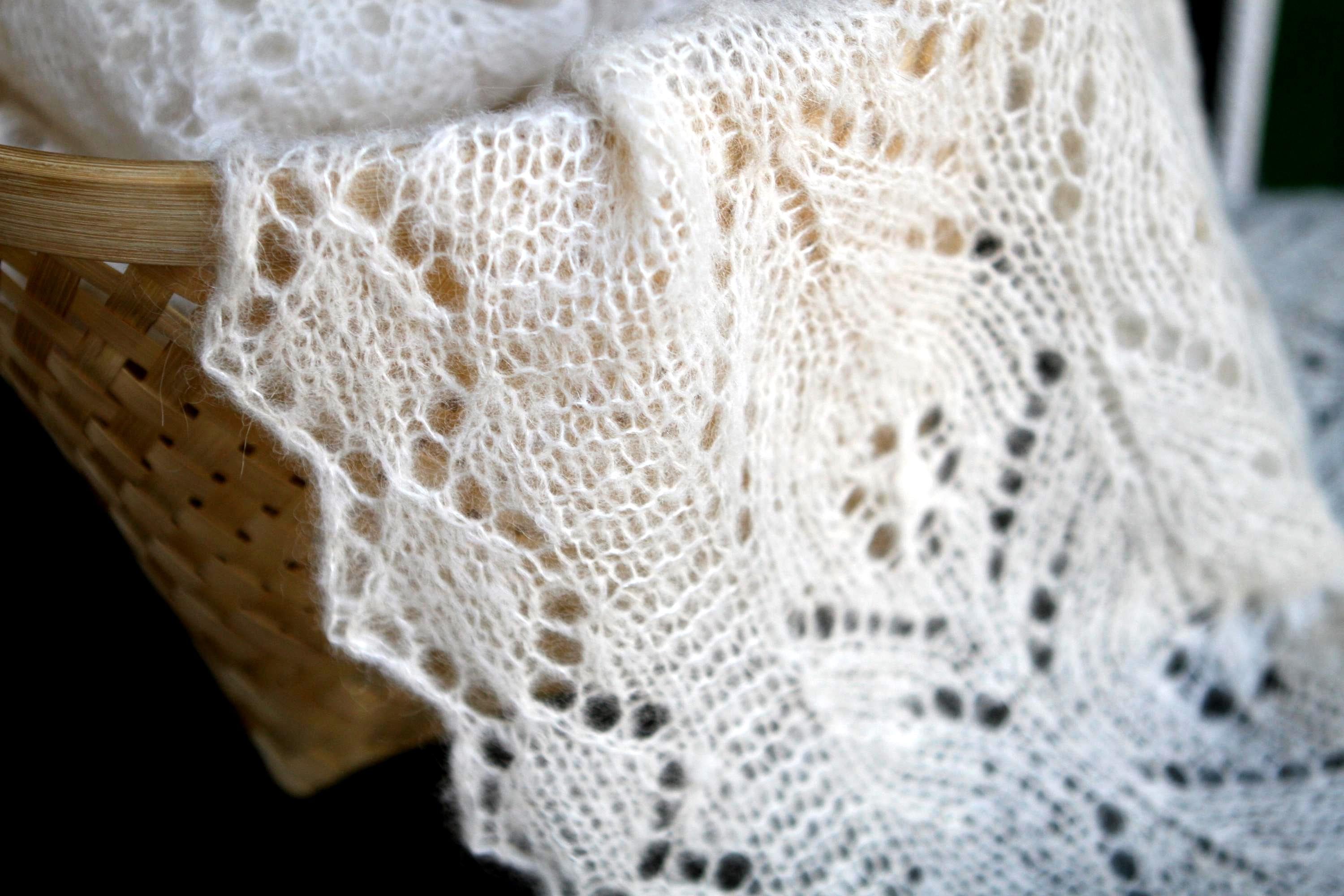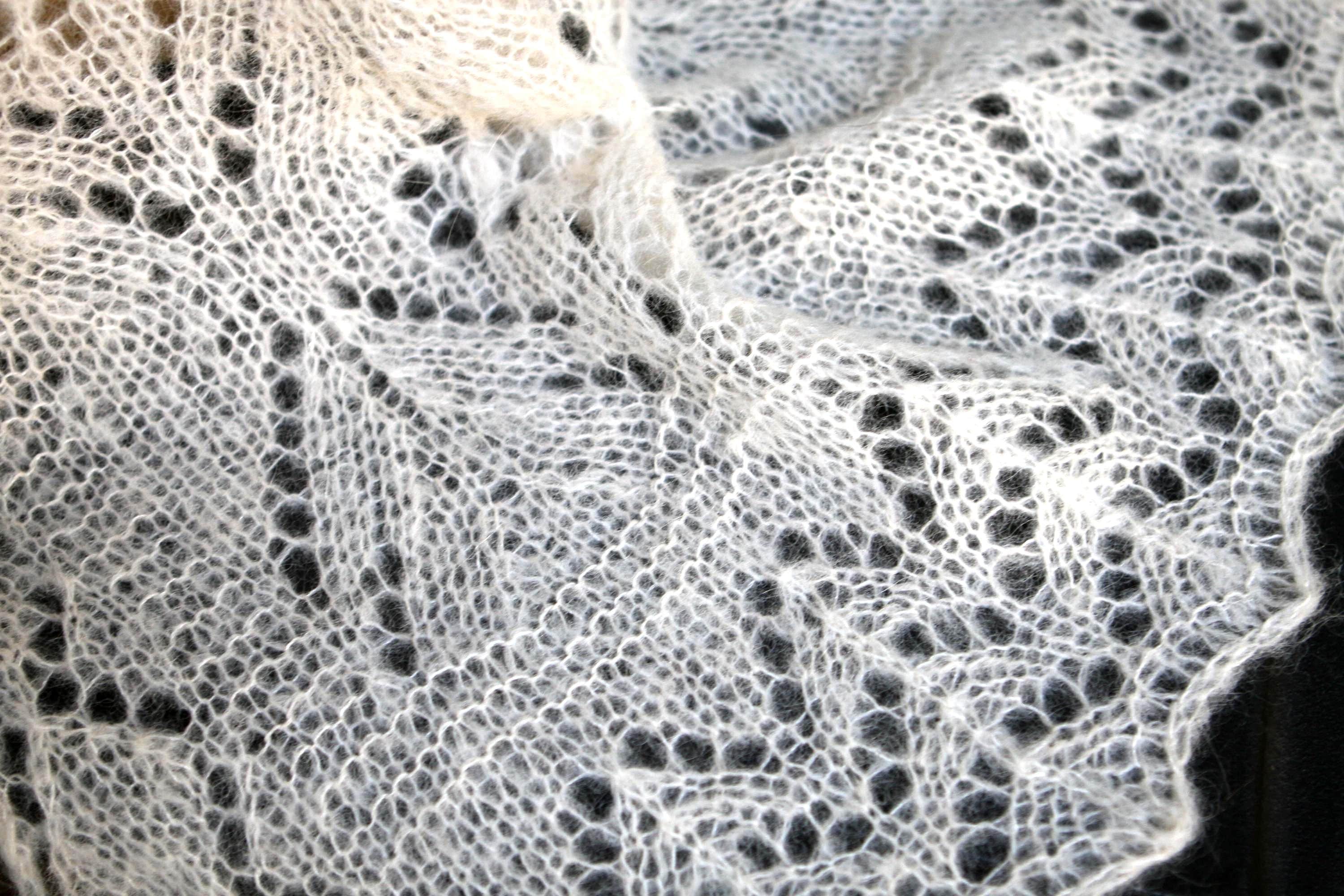 This shawl is knitted using luxurious yarn of Drops Brushed Alpaca Silk (77% alpaca, 23% silk). The yarn is feather-light and surprisingly warm. Very soft and fine yarn makes this shawl comfortable to wear and is suitable for wedding. Color – natural white.