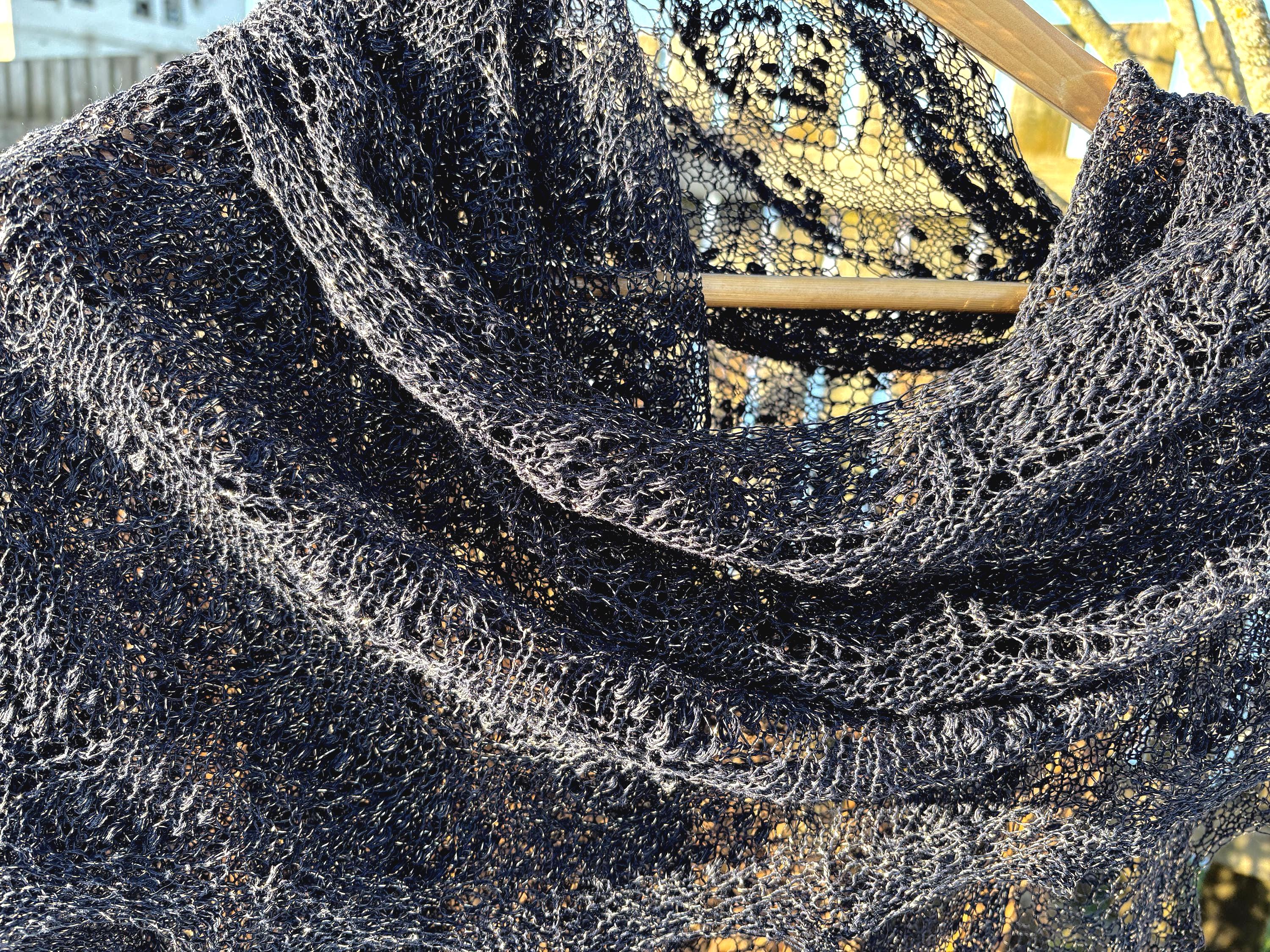 Luxurious Hand Knitted Lace Shawl – Night Blue with Golden Threads