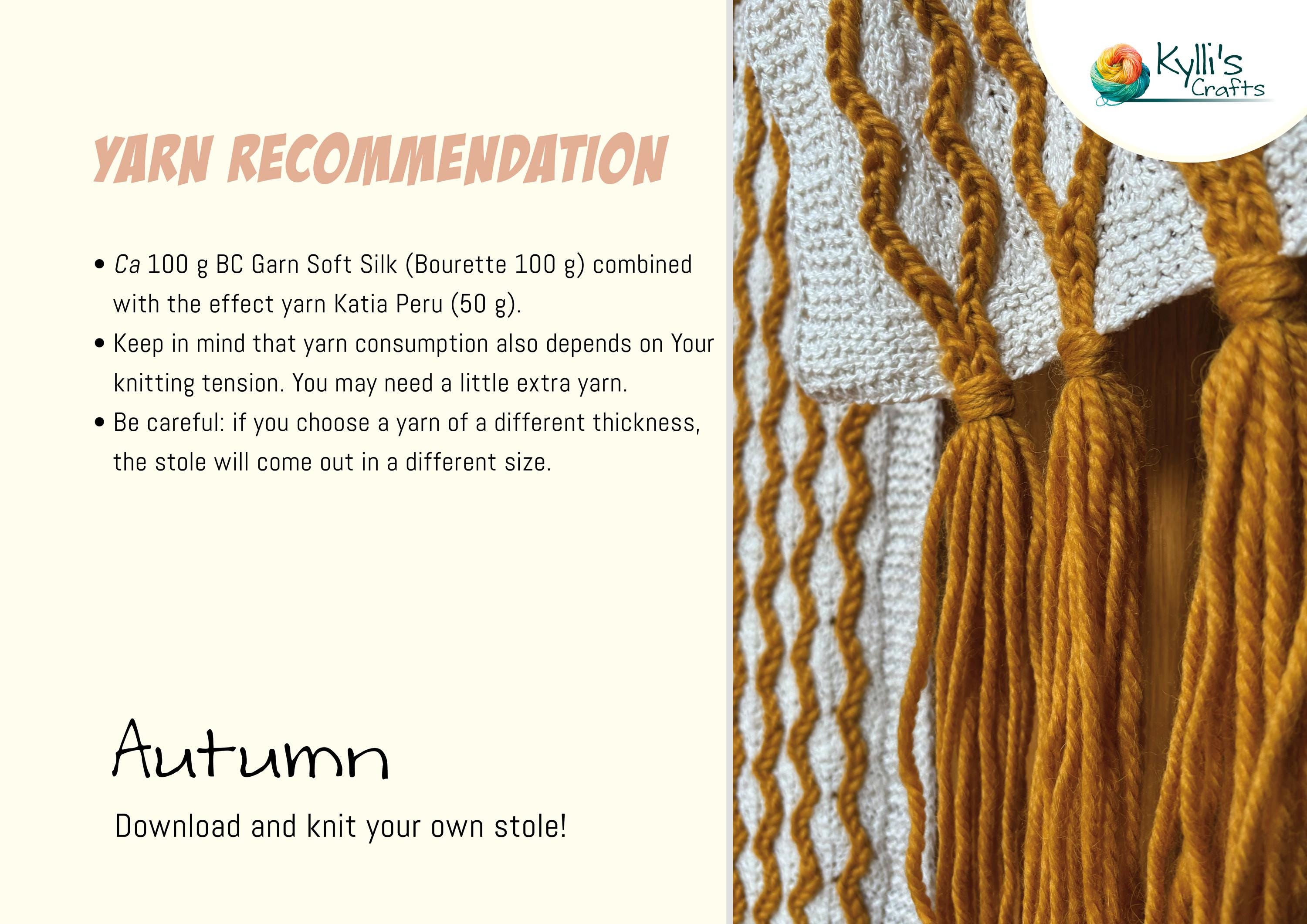 The scarf shown in the photo is a sample, knitted using BC Garn Soft Silk (Bourette 100 g) combined with the effect yarn Katia Peru (50 g).