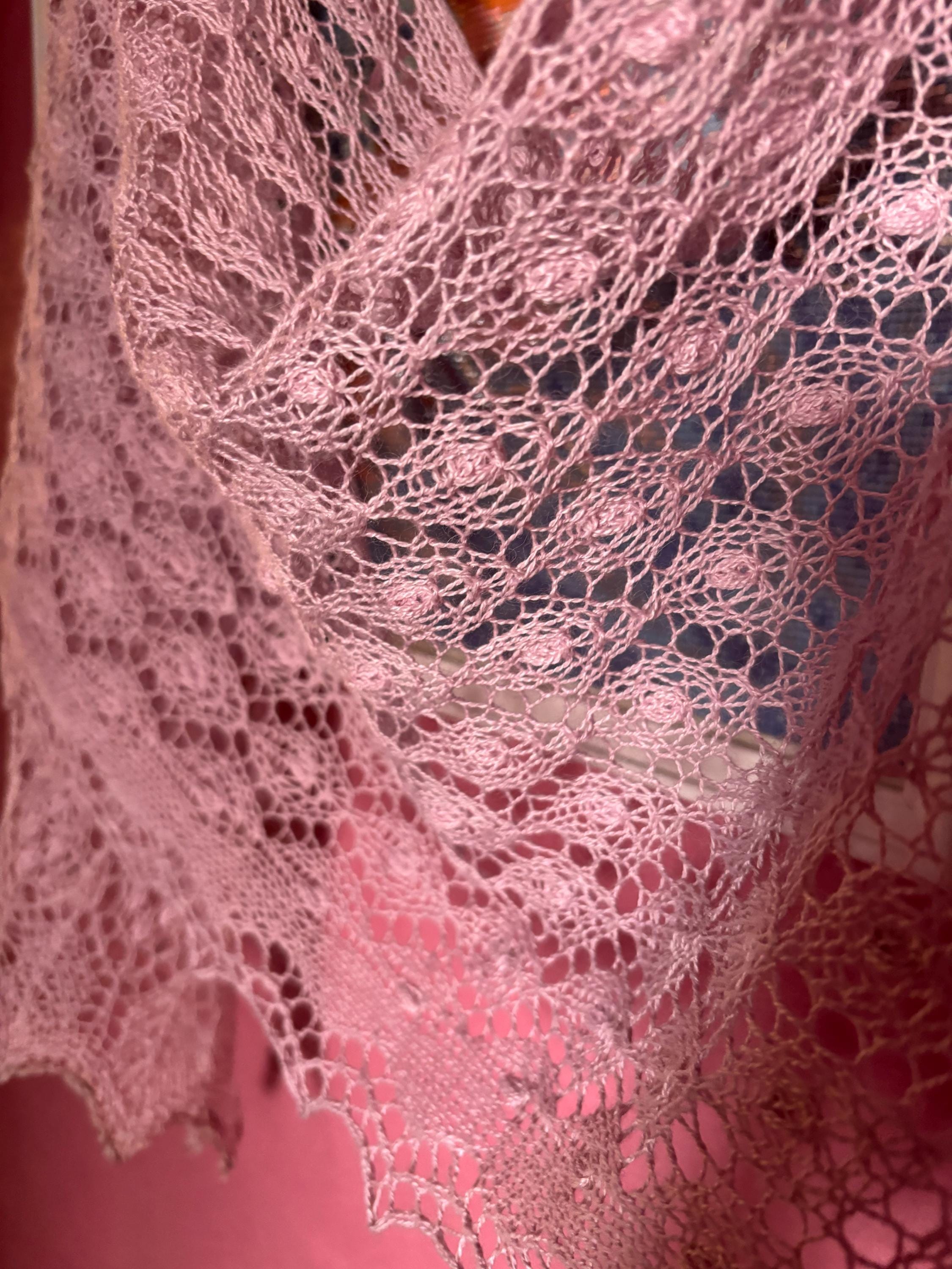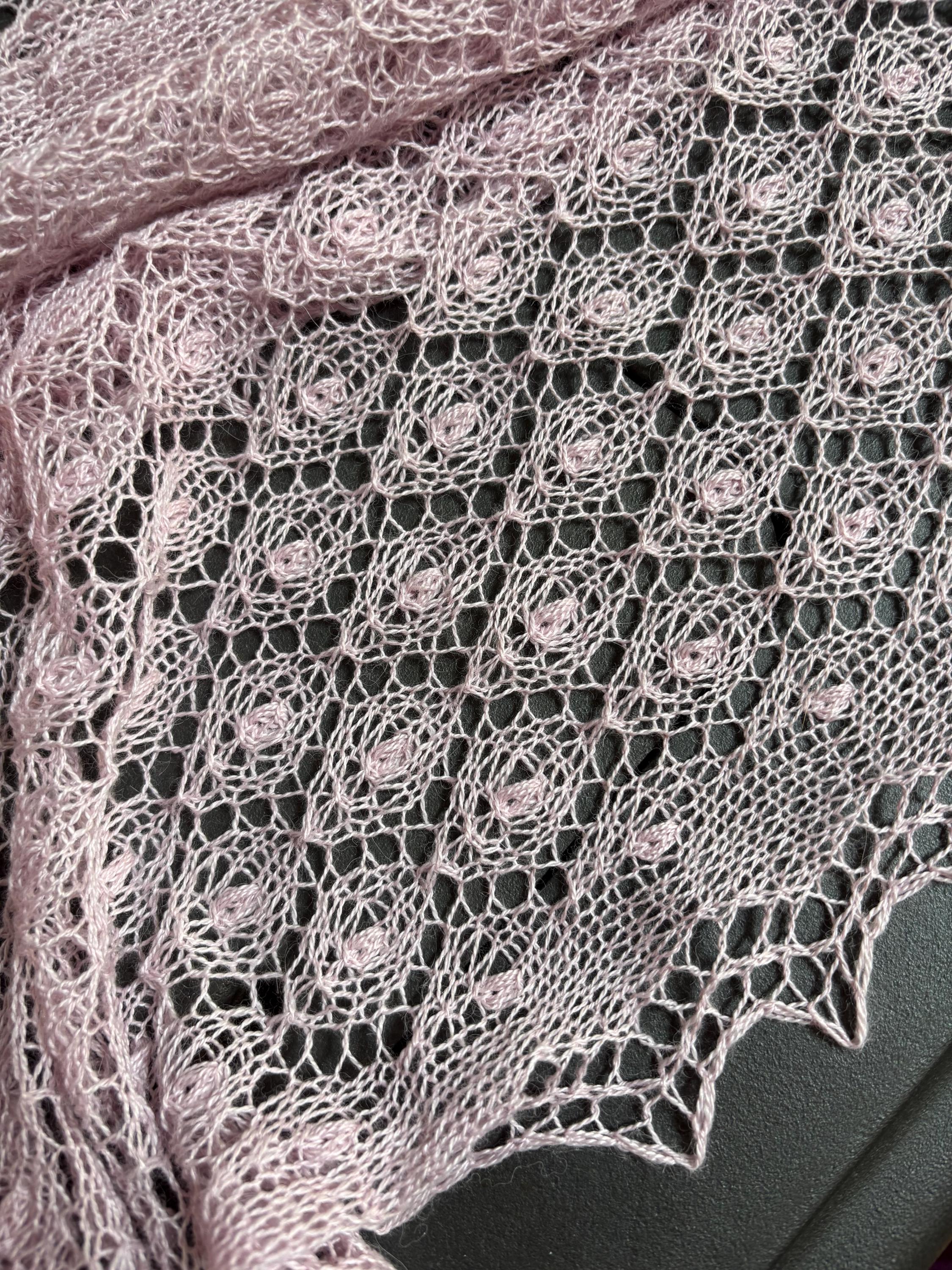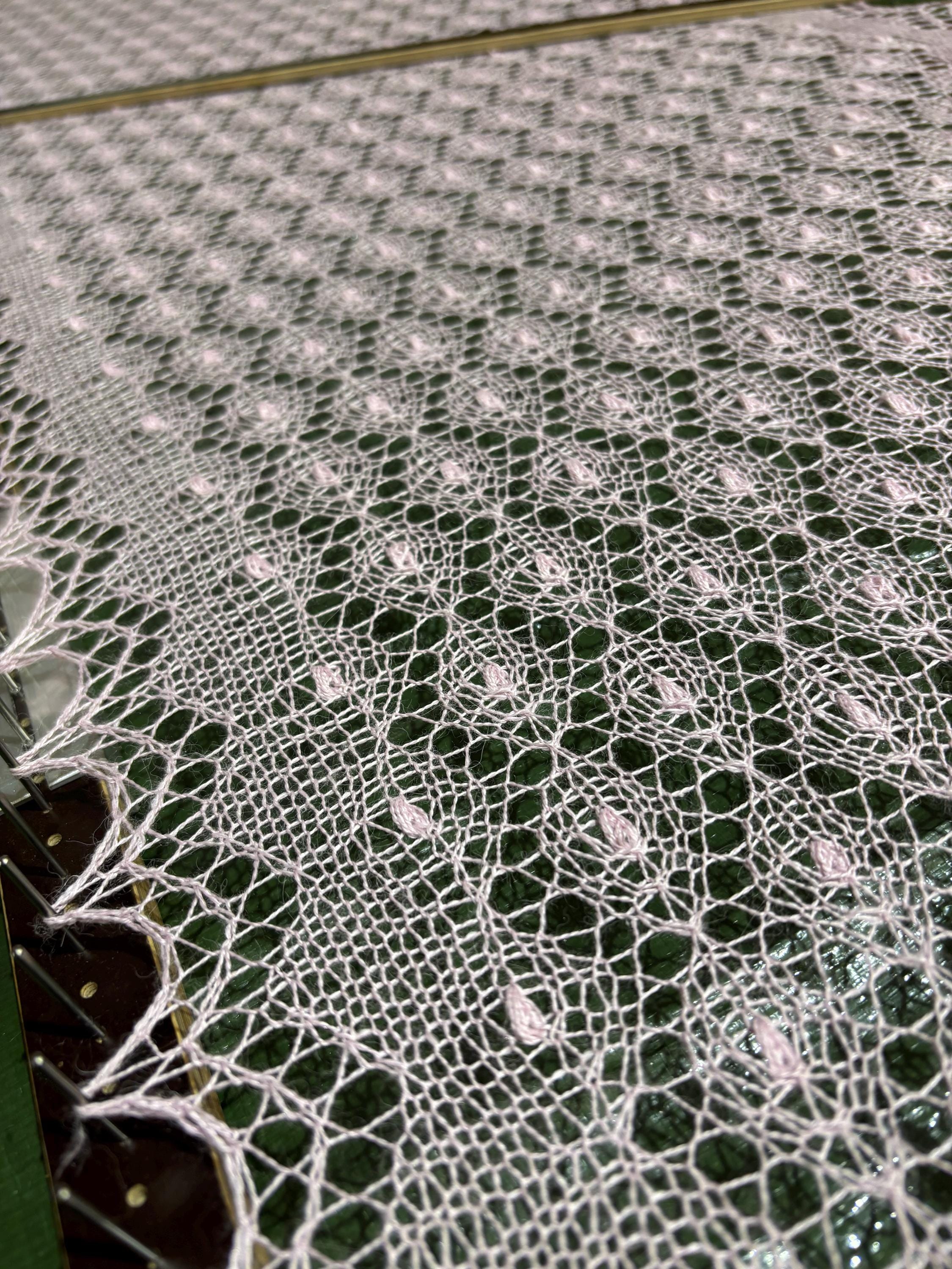 Lay flat to dry, shaping the shawl and pinning the picot edging as needed.