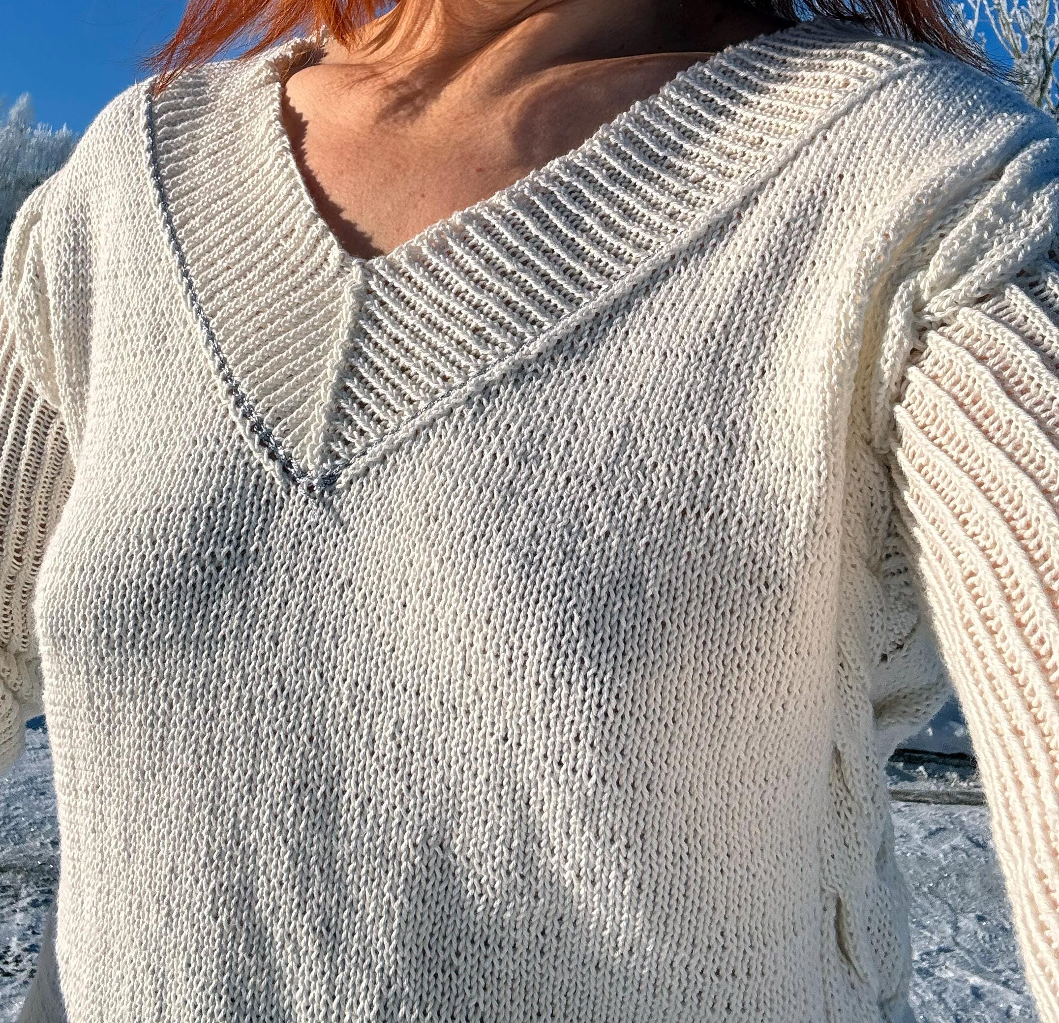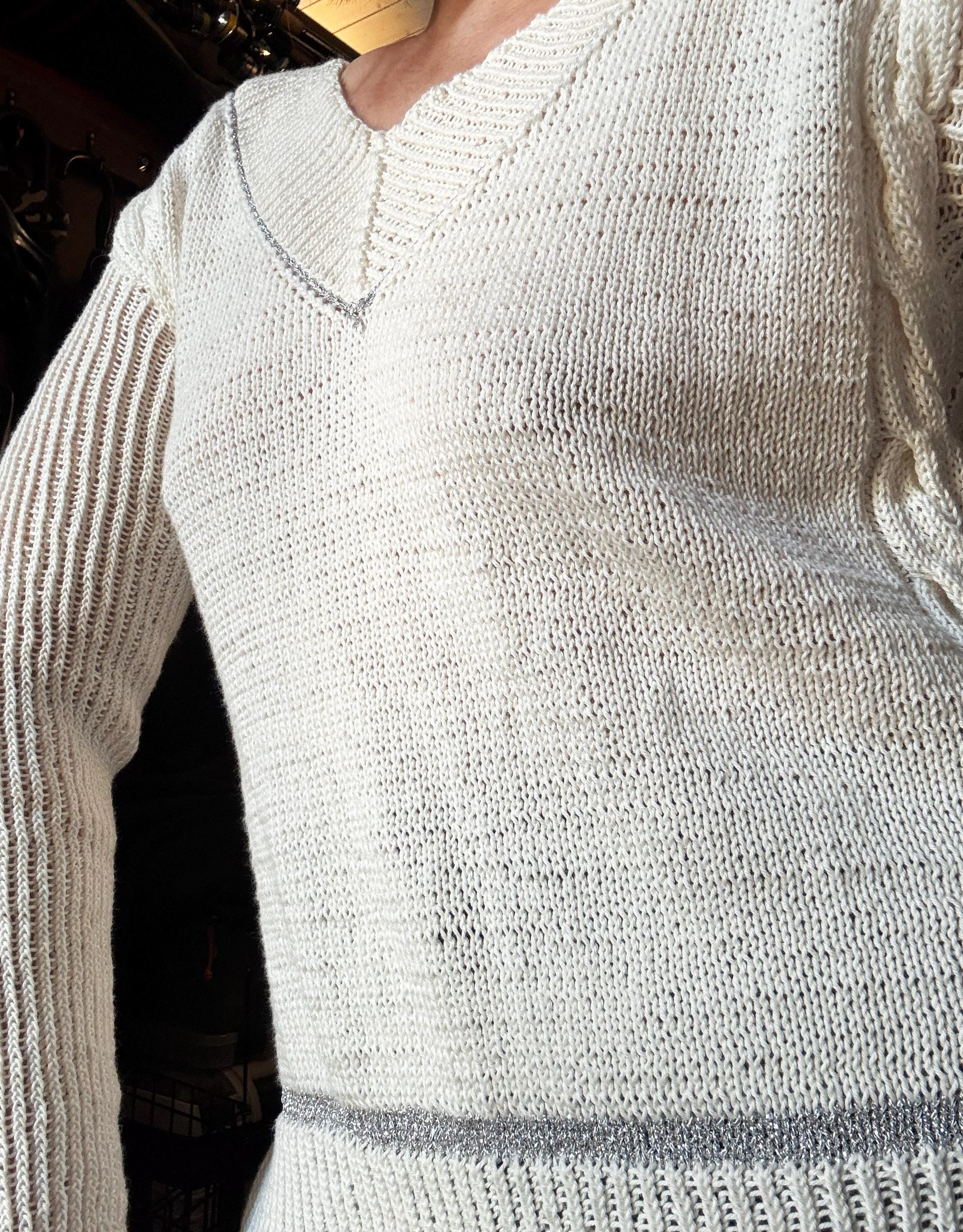 Knitted Cotton Sweater | WHITE SUMMER | V-neckline, Silver Stripes, Ready-Made